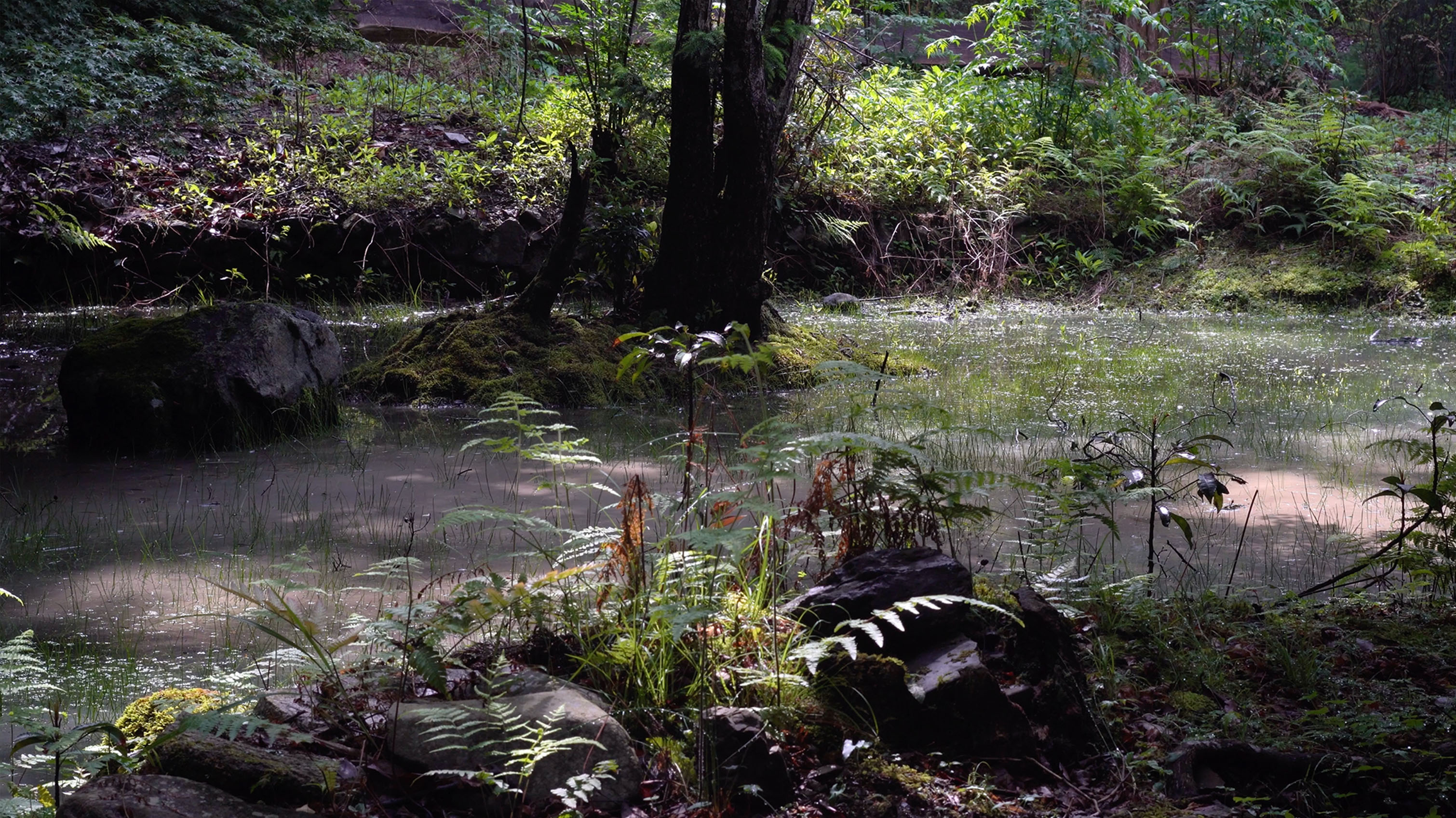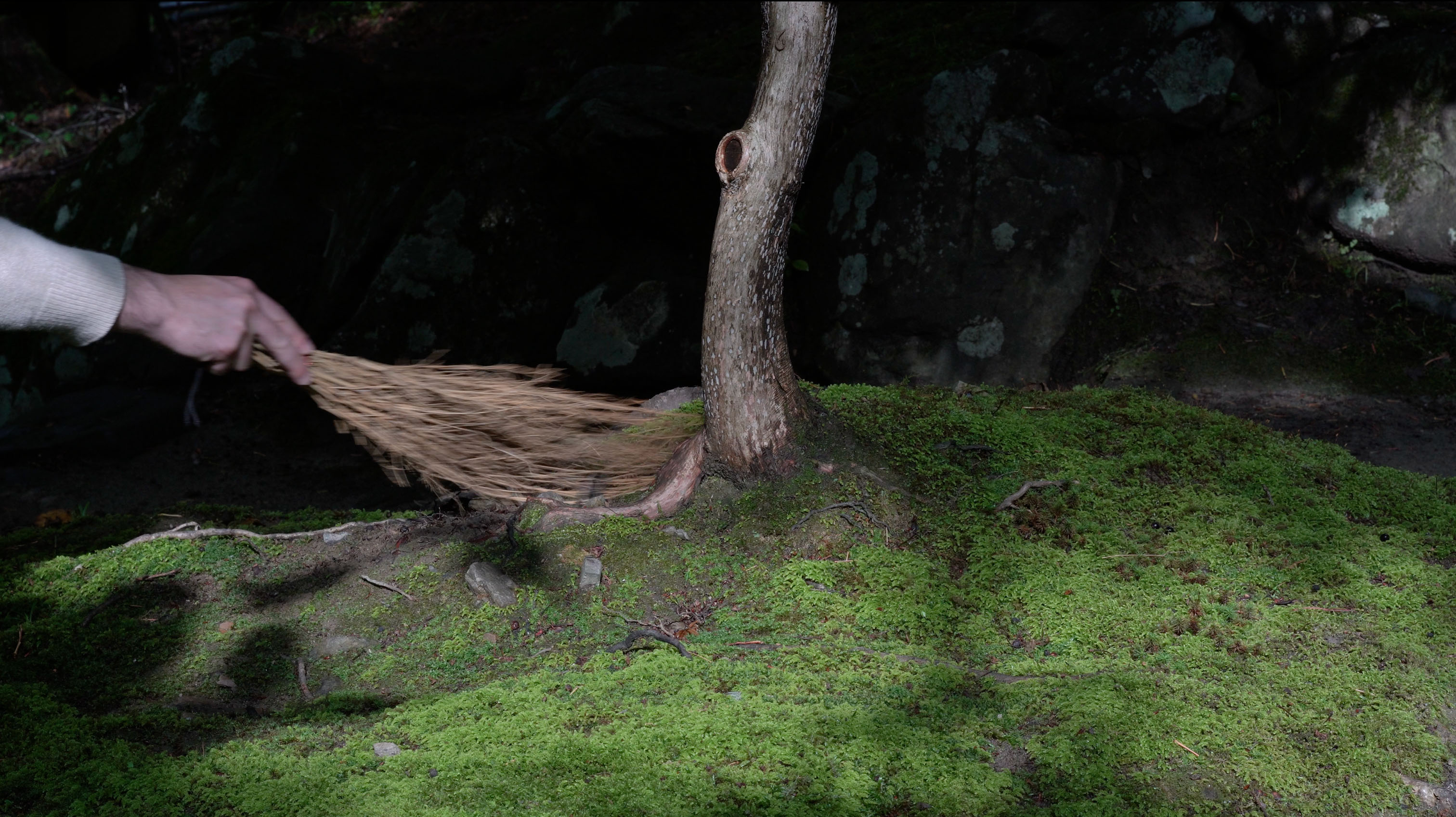 In the video footage of meticulous cleaning activities in two gardens located in Northern Kyoto, Seiken-ji temple garden and Kagata’s family residence garden, alternate with images of abandoned urban green areas around the Sakyo-ku district.